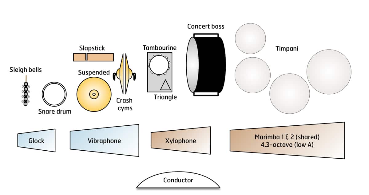 The piece makes for a great introduction to mallet percussion using mainly stepwise motion for the melody and supporting roles. The accompanying orchestral battery parts should fall well within the range of most beginners.