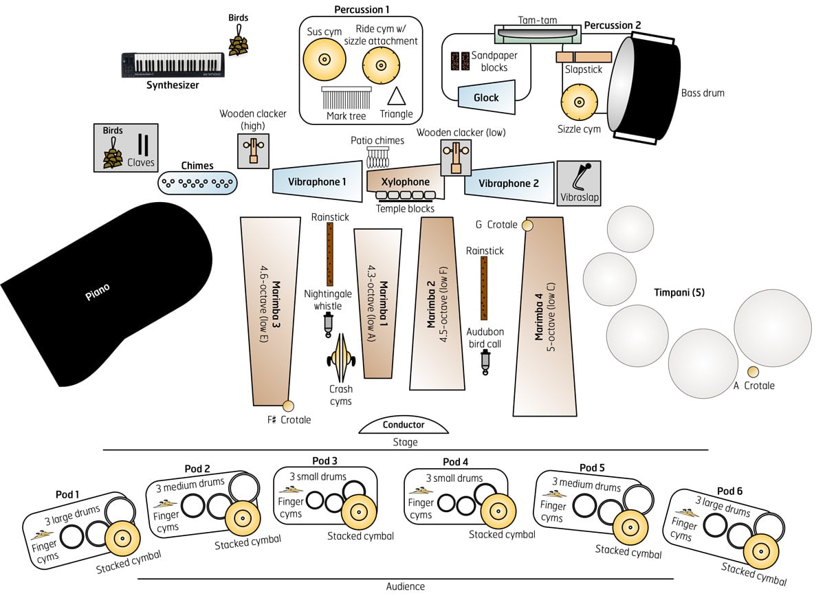 Utilizing a large array for percussion orchestra, piano, and synthesizer, various natural sounds such as bird calls, organic wooden effects, and leafy bundle rods are used to embellish the modern sonorities. Six performers serve as a focal point throughout in “pod” configurations, each with three drums, stacked cymbals, and wood textures throughout (rims, bundled sticks, etc.) serving as highlighted branches to the foundation of the piece. These pods use advanced, deliberate stickings, emphasizing that they are to be enjoyed visually as well as musically.