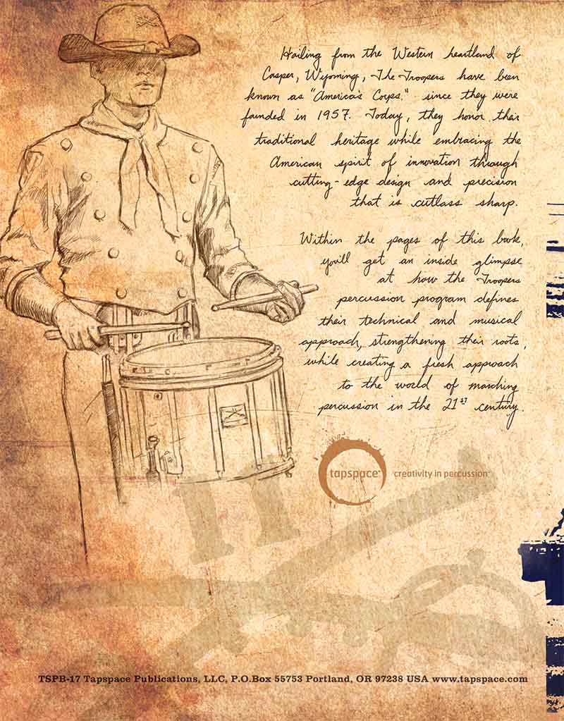 Inside TROOPERCUSSION, you’ll get a peek at how the Troopers percussion program defines their technical and musical approach, strengthening their roots, while creating a fresh approach to the world of marching percussion in the 21st Century. Weighing in at 90 pages, the book is packed to the hilt with content, and not just for audition candidates. Percussionists and drum corps fans of all levels will find useful tips and innovative musical examples throughout the extensive and fully orchestrated exercises and etudes for both the battery and front ensemble sections.
