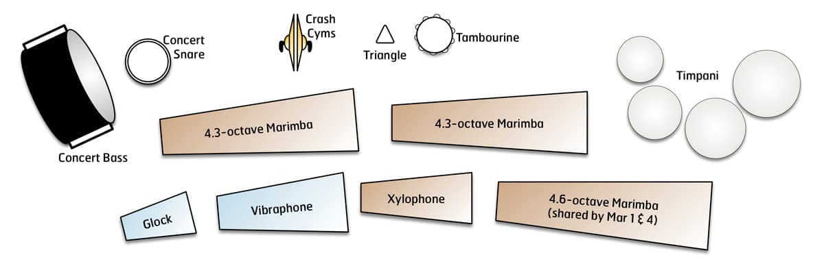 This arrangement is for a large percussion ensemble of 13 players but can also be performed as a 7-player mallet choir without timpani or unpitched percussion.
