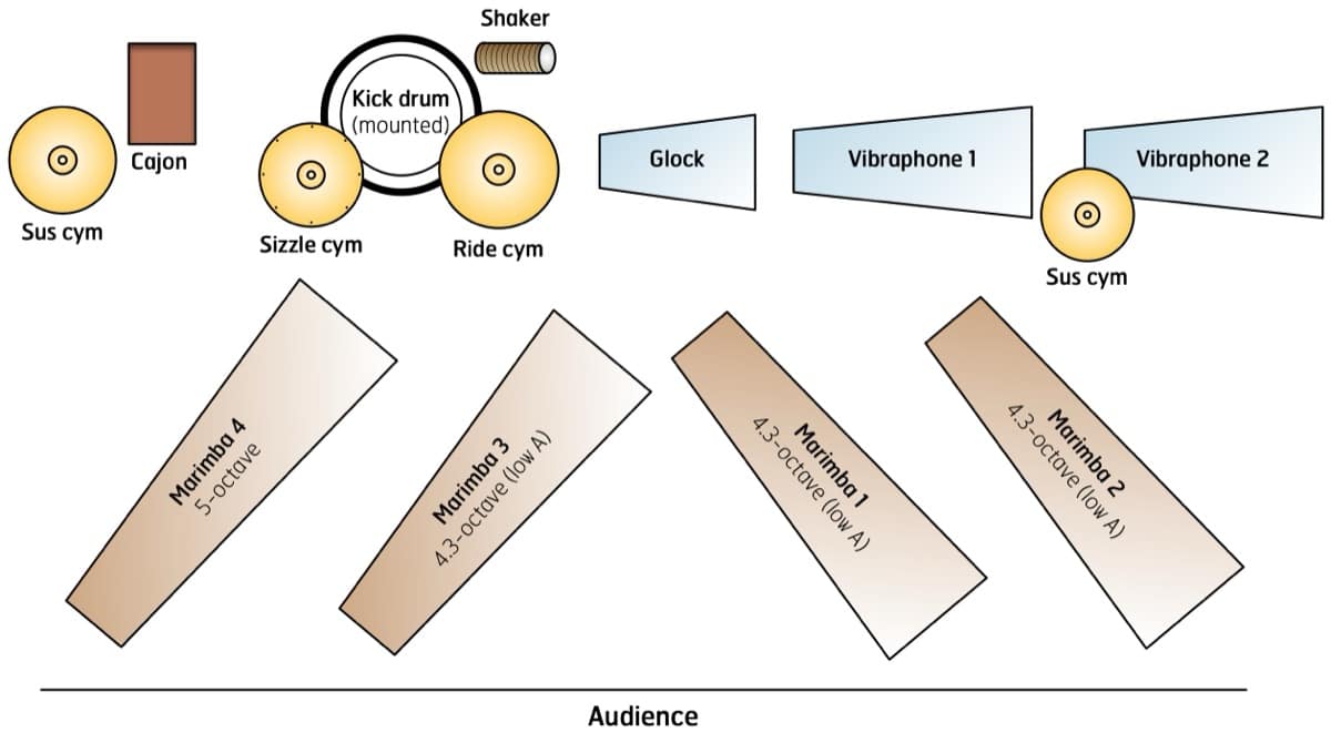 • 4 Marimbas — (3) low A, (1) 5-octave