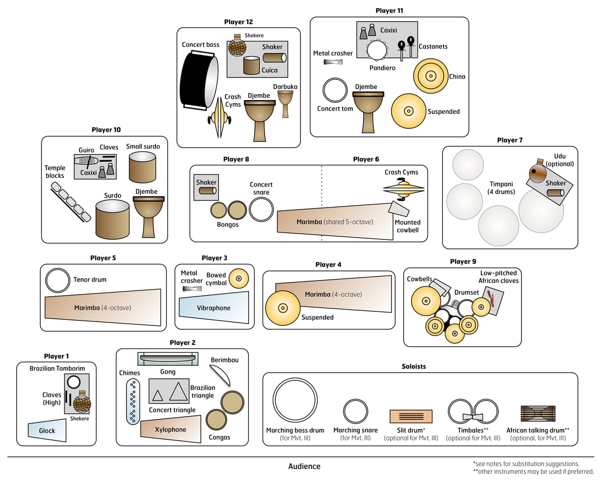 • Accessories (3 pairs of claves, Brazilian tamborim, shekere, berimbau, large Brazilian triangle, concert triangle, 2 metal crashers, water phone or bowed cymbal, bass bow, small cowbell, medium shaker, agogo bells, medium metal shaker, high and low cowbell, foot clave or woodblock, wooden temple blocks, guiro, orchestral tambourine, slit drum with 6 pitches, 2 caxixi, djembe, 2 small caxixi, pandiero, paddle castanets, cuica)
