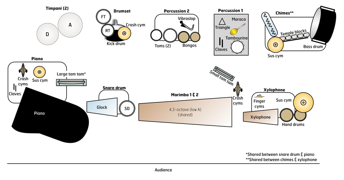 - Drums (bongos, 2 hand drums (high, low) snare drum, 2 concert toms, concert bass drum)