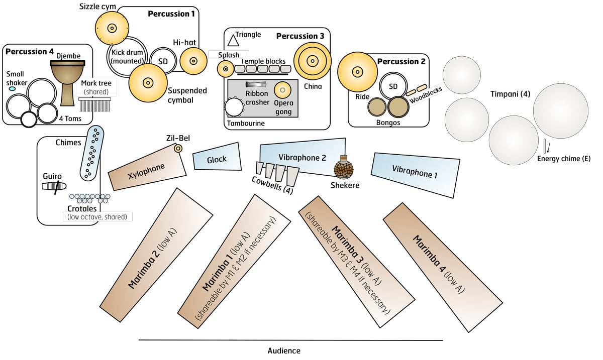 * 4 marimbas are ideal, however the parts are structured so that M1 and M2 can share an instrument, and M3 and M4 can share an instrument.