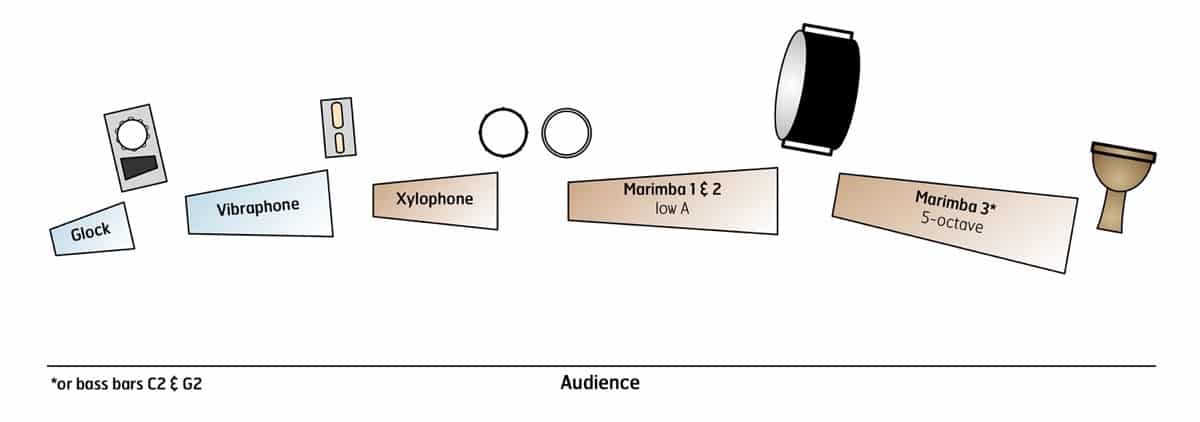 The work is playable with only five players, while the optional sixth part on a five-octave marimba (or bass bars C2 and G2) and hand drum can be utilized if personnel and equipment allow.