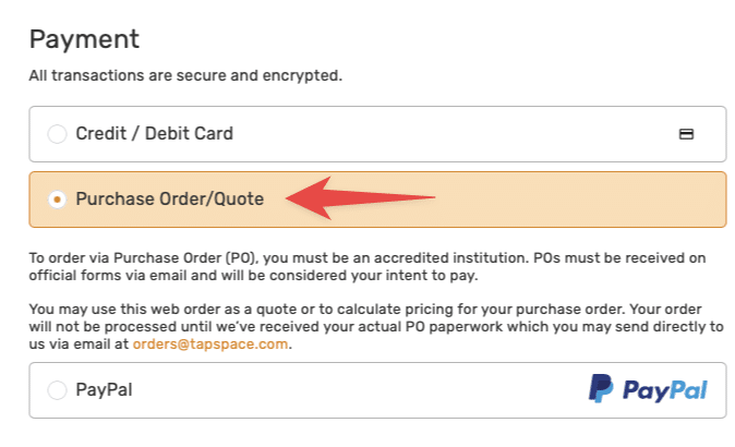 For fastest processing, POs may be emailed to us directly at orders@tapspace.com.